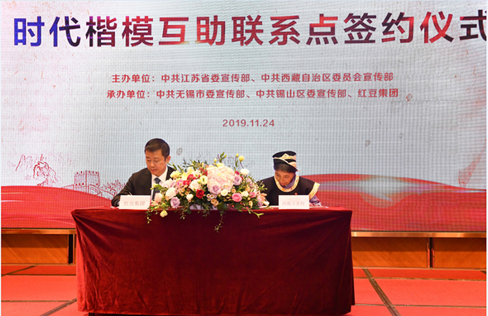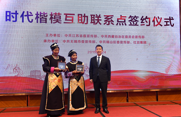 此次結對互助活動是江蘇和西藏自治區共同深化典型學習宣傳工作的探索實踐,有助于匯聚榜樣力量、放大典型效應,推動愛國主義教育和公民道德建設。活動上,兩位“時代楷模”周海江和卓嘎分別代表紅豆集團和西藏自治區山南市隆子縣玉麥村簽訂了結對共建協議,仁青洛布和袁飛共同為時代楷模互助聯系點揭牌。卓嘎、央宗姐妹向參會嘉賓們敬獻哈達,周海江還向卓嘎、央宗姐妹贈送了紅豆吉祥物。