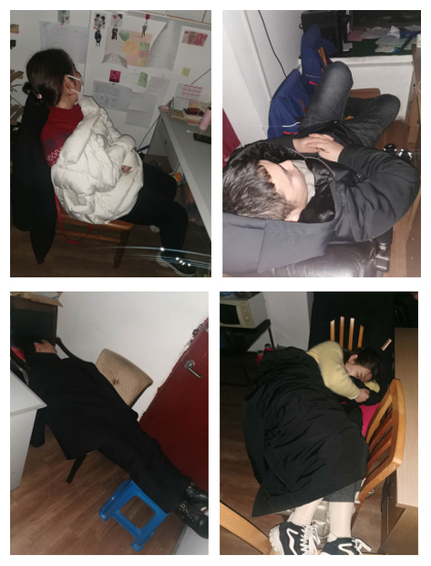 于是大家都開始打電話回家。過一會(huì),到了小區(qū)封門的時(shí)間,雨還在一點(diǎn)一點(diǎn)的下。辦公室里沒被子,也沒更多保暖衣物,更不可能有床。幾個(gè)物業(yè)人你看看我,我看看你,女同志就緊挨在一起,靠在沙發(fā)上,閉上眼睛,能休息就休息一會(huì)兒!兩個(gè)男同志找來幾張凳子拼湊在一起,當(dāng)個(gè)簡易床躺一會(huì)兒。半夜不舒服了,坐起來走一會(huì)兒,就這么著天開始亮了。