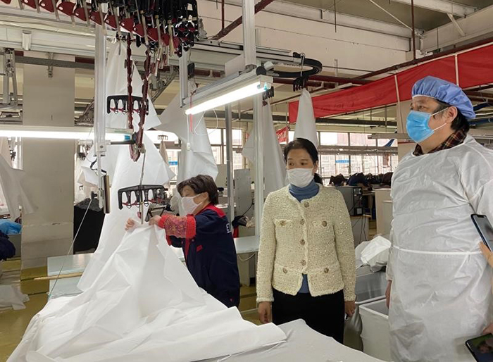 戴敏君帶領(lǐng)紅豆藝術(shù)團(tuán)參觀防護(hù)服生產(chǎn)線