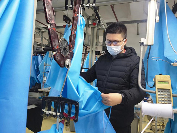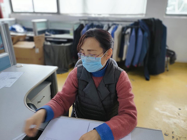 生產(chǎn)任務(wù)更艱巨,面料顏色要求比較特殊,而目前防護(hù)材料又是全球緊缺物資,因此,解決3月1日上午出運(yùn)的3.8萬件面料問題,最為關(guān)鍵。老黨員顧彩紅再次自動請纓,挑下采購面料的重?fù)?dān)。