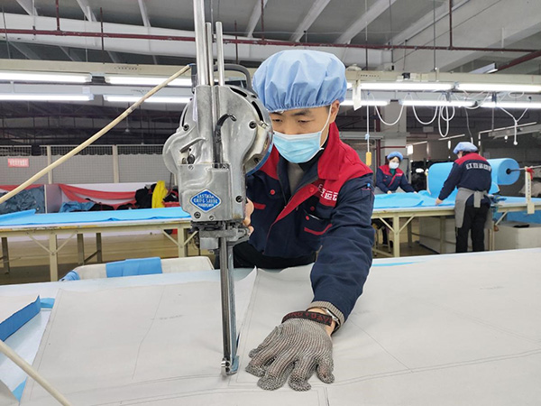 “沒有現(xiàn)成的提拉工具,就想其他辦法。先用鏟車把面料運(yùn)到指定區(qū)域,為提高效率,我們用2個板凳自制了工具,順利將面料快速送上裁剪臺。”錢學(xué)民笑著說。