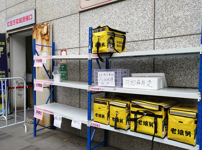 這個時候,中山路紅豆萬花城保安韓立國挺身而出,他帶領團隊將多個貨架搬到商場外,按商家分區,商戶只需將外賣放至指定位置,由外賣員收取即可。這樣操作既有效避免了人員聚集,又助商戶提升了業績。