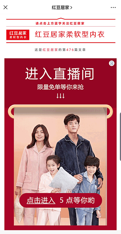 疫情來襲,“宅”成為大部分人的生活常態,“紅粉”有了更多時間觀看直播,也積攢了大量消費需求。在紅豆居家的官方微信公眾號后臺,500萬紅粉熱情詢問是否有睡衣活動。在這場宅家戰疫中,居家睡衣或成最大剛需。2月4日紅豆居家上線“微商城”小程序。2月7日,紅豆居家推出限時閃購睡衣專場的“你需要的宅家睡衣,免郵送貨上門”,吸引25萬觀眾觀看。2月13日,紅豆居家又推出“6000萬優惠券免費搶”主題直播,用分享給好友助力邀請的方式引流吸粉。基于紅豆居家的大流量,騰訊公司主動開放內部直播名額。2月21日,紅豆居家首次上線騰訊直播,由紅豆居家品牌文化部負責人張浩和產品設計負責人程莉擔任主播進行趣味互動、介紹,共吸引5.9萬次人氣,新增訂閱人數1489人,點贊數達到7.6萬多人次,直播2小時期間銷售近15萬元。