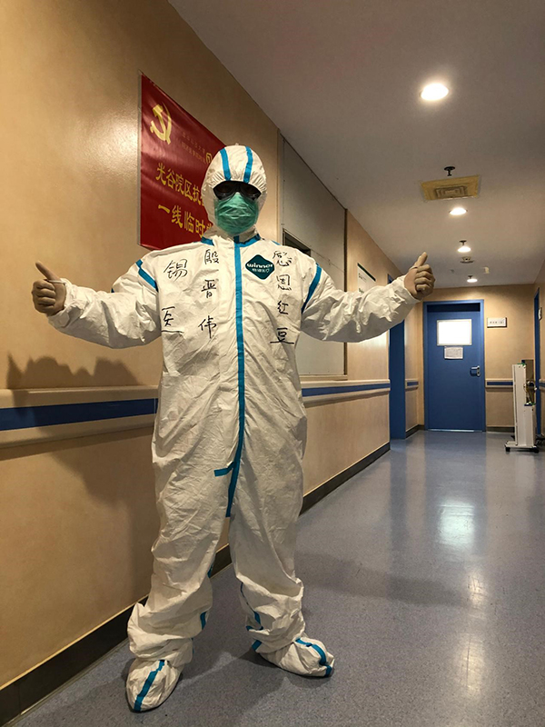 遠(yuǎn)在武漢的殷晉偉醫(yī)生知道這些事情后深為感動,為了表達(dá)對紅豆物業(yè)人的感激之情,特意在防護(hù)服上寫了“感恩紅豆”并拍照發(fā)給張偉。他說,感恩紅豆物業(yè)對我家庭細(xì)致入微的照顧,徹底解除了“后方之憂”,使他在戰(zhàn)疫一線能夠安心工作。