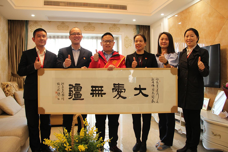 下午,紅豆集團(tuán)常務(wù)副總裁、國際公司董事長戴敏君,集團(tuán)品牌文化部部長錢文華率紅豆物業(yè)團(tuán)隊來到殷晉偉家,上門送上最誠摯的慰問,贈予殷晉偉“大愛無疆”牌匾,代表紅豆集團(tuán)全體員工向英雄表達(dá)崇高敬意!“大愛無疆”牌匾由中國書法家協(xié)會理事、無錫市國畫院院長孫璘先生親自揮毫?xí)鴮懀P鋒蒼勁有力,一筆一畫盡顯孫璘先生對“逆行英雄”的真情真意。