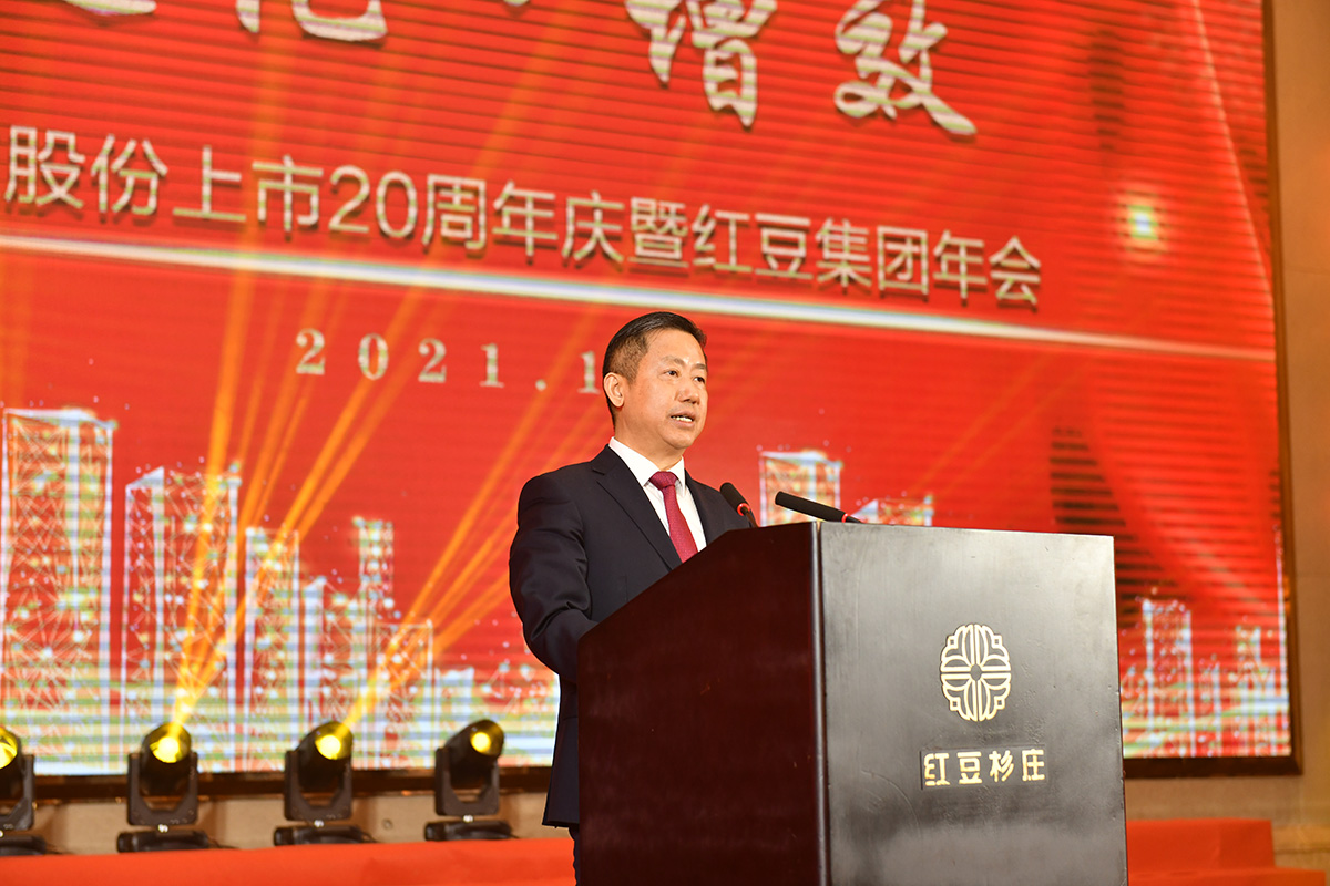 ? ? ? ? 紅豆集團董事局主席周海江出席活動并發表講話,對紅豆股份上市20周年表示祝賀,同時回顧總結了紅豆集團2020年發展成果,并從一流的制度保障、一流的自主創新、一流的自主品牌、一流的自主資本、一流的進化速度、一流的卓越管理等六個方面闡述集團“進化增效,打造世界一流企業”的發展目標。