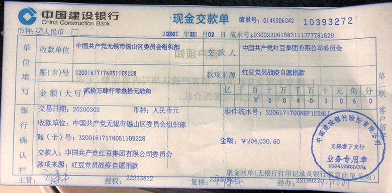 眾志成城,方能共克時(shí)艱,為響應(yīng)黨中央、省委、市委、區(qū)委對(duì)廣大黨員的號(hào)召,助力全國共抗疫情,紅豆集團(tuán)廣大黨員干部迅速行動(dòng),踴躍捐款,用愛心凝聚合力,表達(dá)對(duì)新冠肺炎疫情防控工作的支持,到2月29日,紅豆的1235名黨員僅僅用了不到一天的時(shí)間,自愿捐款總金額達(dá)204030.6元。早在1月30日,剛從國外出差回來的紅豆集團(tuán)黨委書記、董事局主席兼CEO周海江就通過錫山區(qū)委組織部向無錫市委組織部交納1000萬元特殊黨費(fèi)用于助力疫情防控。這次捐款他又是第一個(gè)行動(dòng),積極作表率。疫情防控沒有局外人,黨員干部們一致表示,在這個(gè)特殊時(shí)期,大家必須行動(dòng)起來,既然不能到一線抗擊疫情,就要在本職崗位上為疫情防控盡一份綿薄之力。