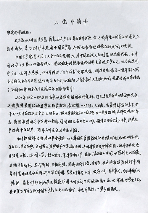 紅豆集團國際公司的員工梁艷的再次向黨組織遞交入黨申請書的原因很簡單,“為了支持一線疫情防控,集團緊急組建黨員突擊隊支援防護服、口罩生產(chǎn)線,負責最緊急、最艱苦的工作。我也報名了,因我還不是黨員,所以沒有把最重的任務(wù)安排給我?!笔艿缴磉咟h員的激勵,讓梁艷鼓起勇氣,擬出了這份“疫情火線入黨申請書”。
