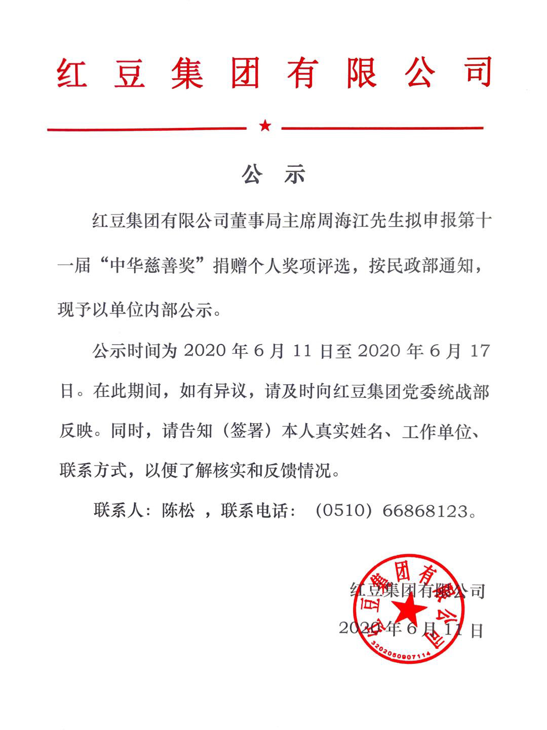 關于紅豆集團董事局主席周海江申報第十一屆“中華慈善獎”捐贈個人獎項評選的公示
